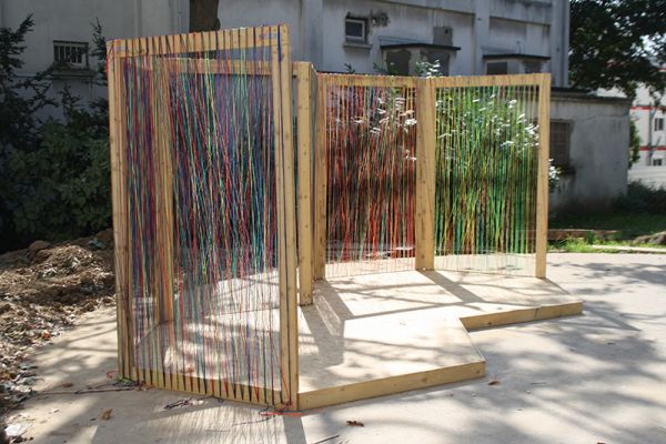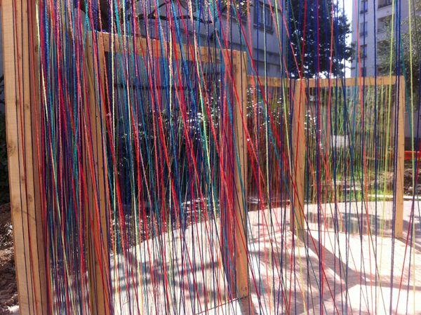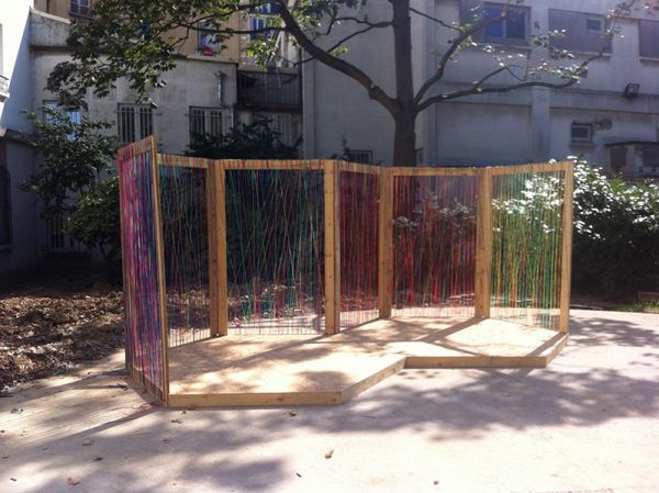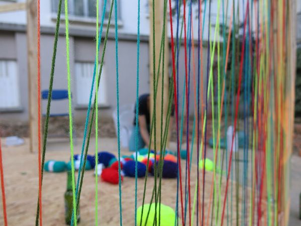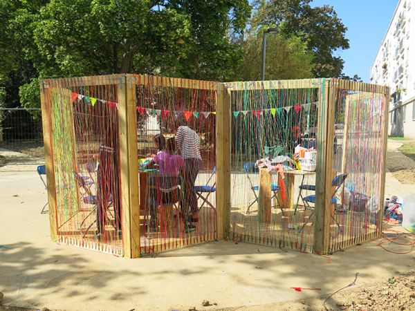 Ce mobilier est composé de deux pupitres hexagonaux pour recevoir deux ateliers textile Cette installation éphémère est bordée de sa protection textile en maillage laine pour créer un support d’accroches des créations et une identification de l’atelier. Le mobile a été construit en lien avec l’association qui promouvoit l’investissemnt de l’espace urbain par les habitants et de créer des connexions humaines.